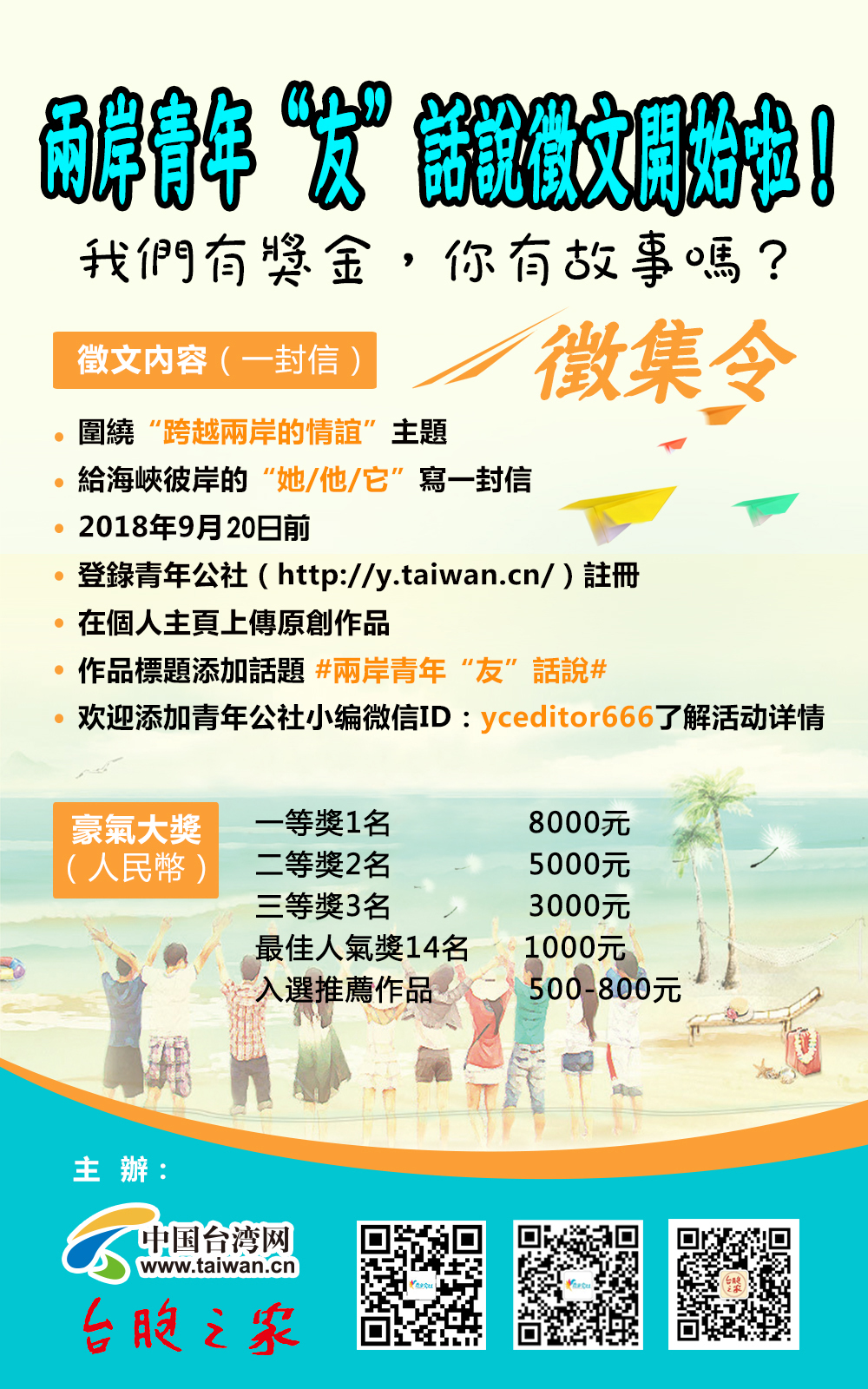 4.投稿过程中遇到问题请联系青年公社小编,微信(ID:yceditor666),备注参加两岸青年“友”话说征文活动。