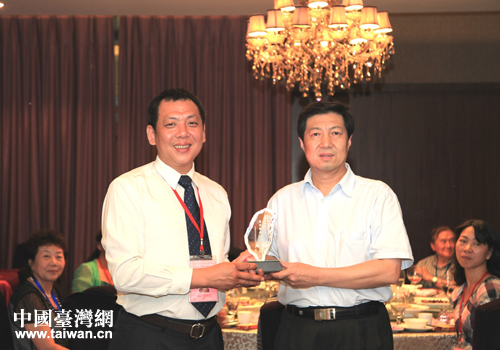 台湾中华两岸婚姻协调促进会理事长钟锦明(左)向省台办副主任周越明赠送纪念品。(云南省台办 李仁兴 摄)