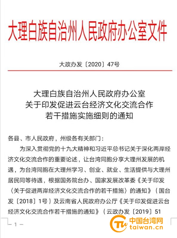 中国台湾网1月22日讯 为深入贯彻党的十九大精神和习近平总书记关于深化两岸经济文化交流合作的重要思想,积极践行“两岸一家亲”理念,让台湾同胞分享云南省大理州发展机遇,为台湾同胞在大理州学习、创业、就业、生活提供与大理州居民同等待遇,大理州结合实际,制定出台了《大理白族自治州人民政府办公室关于印发促进云台经济文化交流合作若干措施实施细则的通知》(以下简称大理州惠台“50条措施”)。