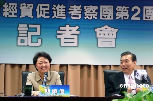 七月十七日下午,第二批“两岸经贸促进考察团”团长、商务部商贸服务司副司长门晓伟(左)在离台记者会中披露,在以流通食品、百货及消费品为主的采购中,两岸企业五天来现场成交金额达一亿四千六百万美元,未来一年内采购意向超出六亿美元,图为她和台北世贸中心董事长王志刚在记者会中。 中新社发 刘舒凌 摄