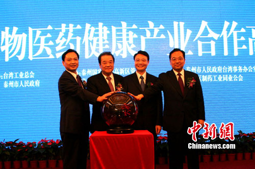 当日,江苏省副省长何权、中共泰州市委书记张雷、泰州市代市长徐郭平以及台湾工业总会理事长陈武雄共同为由台湾工业总会和泰州医药高新区共同负责开发建设而设立的“海峡两岸(泰州)生技产业园”揭牌。海峡两岸生物医药健康领域的400多名精英出席并共同见证。