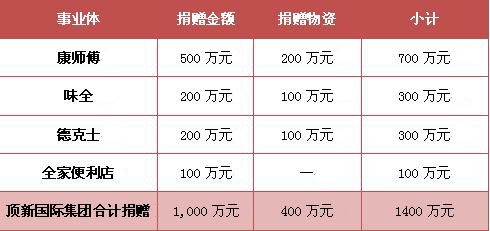 截止目前,顶星国际集团旗下康师傅、味全、德克士以及全家便利店已累计向地震灾区捐助1400万元现金和物资。