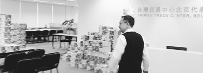 台湾贸易中心北京代表处位于寸土寸金的国贸。相较于这座五星级写字楼,他们办公室显得十分简朴。进门大厅,摆着几排桌椅,贴壁是书架和展示柜。没有贵宾室,大厅右手是一张长条大桌,既接待来客,也召开会议。如果不是桌上有一盆姹紫嫣红的蝴蝶兰,此处更像是和台湾毫无关联的某培训机构。