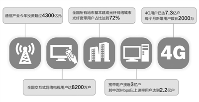 苗圩介绍说,今年,通信产业完成投资超过4300亿元,全国所有地市基本建成光纤网络城市,光纤宽带用户占比达到72%,4G用户突破7亿户,全国IPTV(交互式网络电视)用户已达8200万户;全国固定宽带平均接入速率达到2015年的2倍;新增3个互联网骨干直连点,网间带宽新扩容950G。