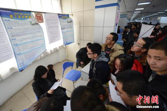 2月7日,山西太原人才市场富士康太原工业园区招聘处,聚集了大批应届大学毕业生前来应聘。当日,山西太原举办马年首场大型招聘会,近万名求职者挤进招聘会现场。中新社发 韦亮 摄