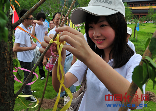 这是“同根同源共享世博” 2010(奉化)海峡两岸青年寻根祈福之旅活动的内容之一。作为“2010中国(奉化)雪窦山弥勒文化节”的重要组成部分,2010(奉化)海峡两岸青年寻根祈福之旅丰富多彩。7月16日晚上,百余名两岸青年齐赴雪窦山参加弥勒文化节活动,观看了精彩隆重的开幕式暨“应梦雪窦”大型梵呗音乐盛典;7月17日上午,先后参观露天弥勒大佛景区、蒋氏遗迹、滕头村等,许多台湾青年对全球坐姿最高的铜制露天弥勒大佛、生态环境优美的滕头村和修缮完好的蒋氏遗迹赞叹不已。两岸青年还在大佛景区内共同种植了友谊树,并把各自写好的心愿放进许愿瓶内挂在了树上,共同祈福祖国繁荣昌盛。