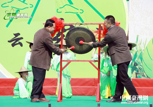 茶文化节上,来自台湾南投县农会的客人与富阳市里山镇有关负责人共同鸣锣,宣布开幕。杭州市副市长戚哮虎、市政协副主席何关新出席开幕式。