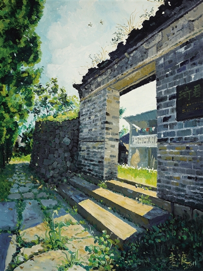 画家麦浪的“故园”画展上,展出了多幅琦君故里的油画,这是琦君故居的旧门台。