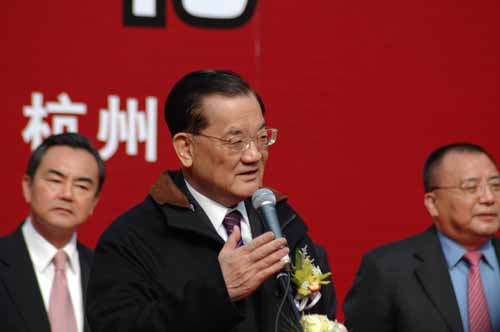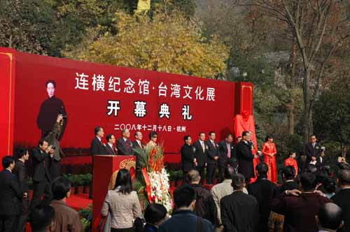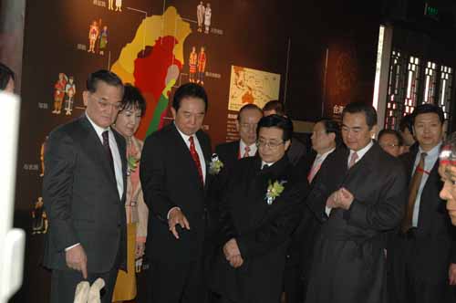 中国国民党荣誉主席连战及夫人连方瑀,中共中央台办、国务院台办主任王毅,海峡两岸关系协会会长陈云林,浙江省委书记赵洪祝,杭州市委书记王国平等参观连横纪念馆-台湾文化展。