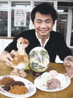 业者杨筠生笑说,鸵鸟蛋冰淇淋,是取鸵鸟蛋加鲜奶、砂糖等材料打制而成,口味与坊间冰品相仿,唯一不同的是,鸵鸟蛋或肉热量、胆固醇、脂肪都低。