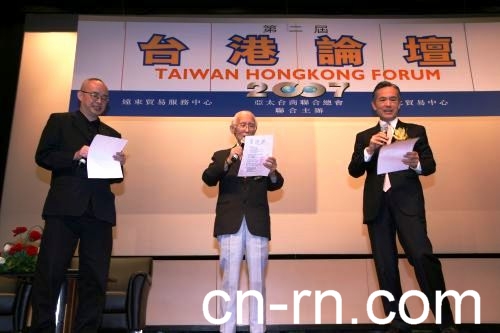 余光中在香港再添了一段“乡愁”/文学泰斗余光中26日下午在香港出席第二届台港论坛,并发表“如何善待母语--从中文谈文化交流”的主题演讲。他(中)在会上,带领台下观众一起朗诵《乡愁》,并即兴续下第五段,“而将来 乡愁是一道长长的桥梁 我来这头 你去那头”。(图片:中评社)