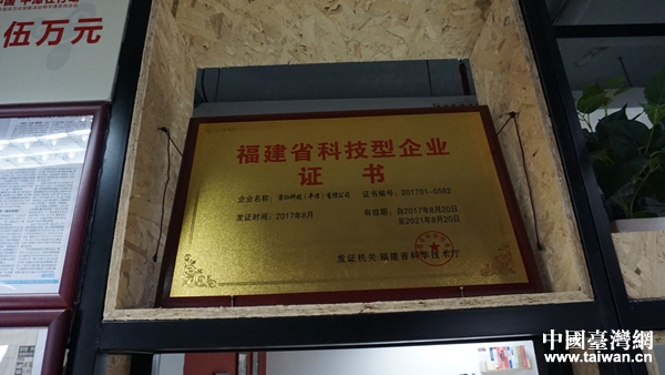 福建省科技型企业证书。(中国台湾网 张玲 摄)