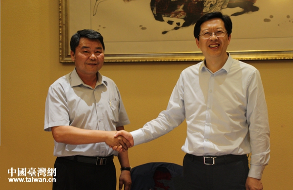 眉山市政府副市长肖忠良(左)与张启盟理事主席座谈交流。(图片来源:眉山市台办)