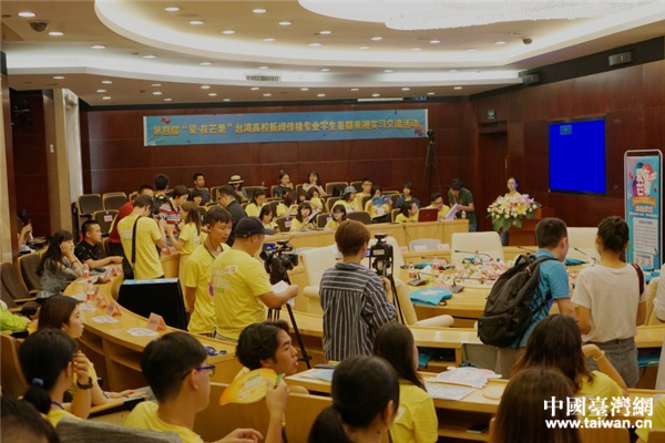 中国台湾网7月4日长沙讯 7月3日上午,“第四届台湾高校新闻传播专业学生暑期来湘‘爱·在芒果’实习交流活动”启动仪式在湖南广播电视台举行。来自台湾政治大学、世新大学等台湾22所高校新闻传播专业的50名学生,现场被分配到湖南广播电视台旗下10个频道及单位,接下来他们将在湖南广播电视台进行近一个月的跟班实习交流。