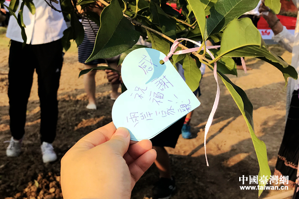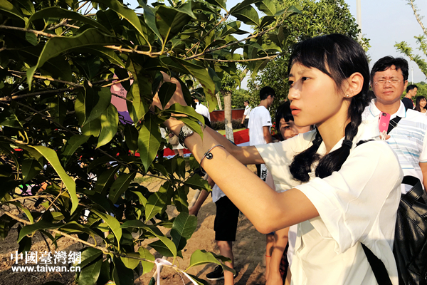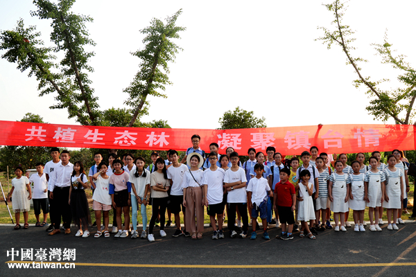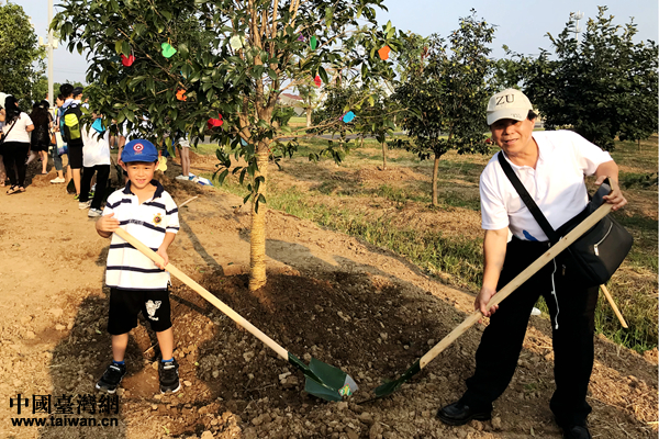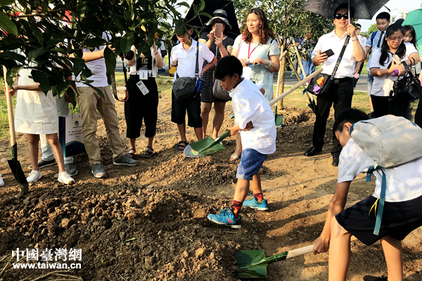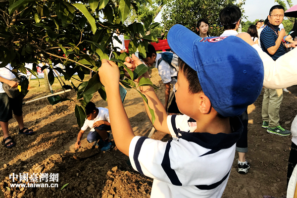 两岸青少年代表及家长代表携手种下同根树。(中国台湾网 赵苗青 摄)