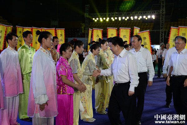 国务院台办副主任龙明彪等人与参加武术表演人员握手。(图片来源:河北台办)