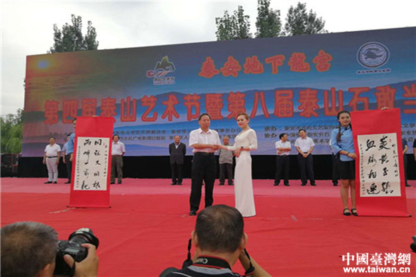 中国台湾网9月7日泰安讯 9月5日上午,第四届泰山艺术节暨第八届“海峡两岸泰山石敢当文化节”在山东省泰安地下龙宫景区开幕。山东省台办交流处副处长魏章柱、中国书法家协会艺术发展中心原常务副主任杨墨纯、泰安市人大常委会副主任曹步山、副市长成丽、台湾中华海峡两岸交流促进会理事长李妮、台湾中国艺术协会副会长蔡丰名等参加了开幕式。