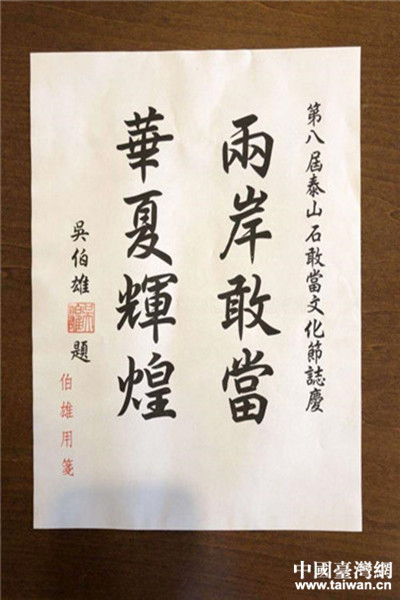 吴伯雄赠送字画。(图片来源:泰安市台办、泰山区台办)