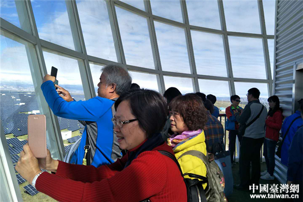 交流团成员争相拍摄光伏电板矩阵。(图片来源:青海省台办)