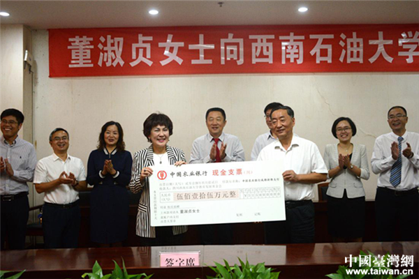 中国台湾网9月19日成都讯 9月12日,经四川省台联牵线,英籍台商董淑贞向西南石油大学捐赠515万元,设立“董妈妈基金”用于资助贫困大学生。西南石油大学党委书记孙一平、四川省台联会长刘琪、秘书长彭英、西南石油大学教育发展基金秘书长亢旗军出席捐赠仪式。
