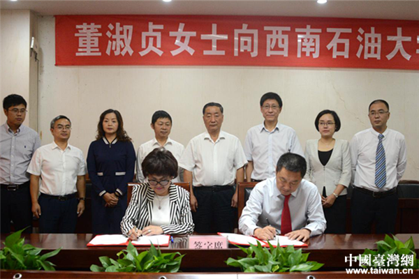 董淑贞与西南石油大学签订捐赠协议。(图片来源:四川省台联)