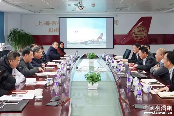 上海市台办主任李文辉、副主任王立新等一行走访上海吉祥航空股份有限公司,并与吉祥航空董事长王均金、总裁赵宏亮等交流座谈。(图片来源:上海市台办)