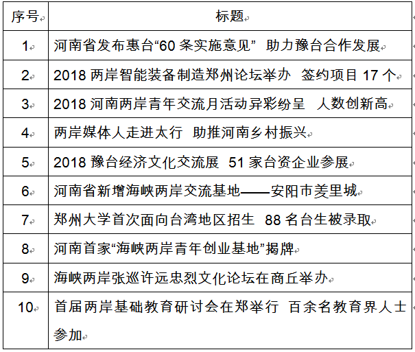 为了进一步宣传河南省对台工作所取得的成就,激发社会各界对对台工作关心、支持和参与热情,河南省台办办于去年12月28日正式在全省范围内开展了“2018年河南省涉台十大新闻”评选活动。结合网络投票结果,综合各方面意见,现将“2018年河南省涉台十大新闻”评选结果公布如下: