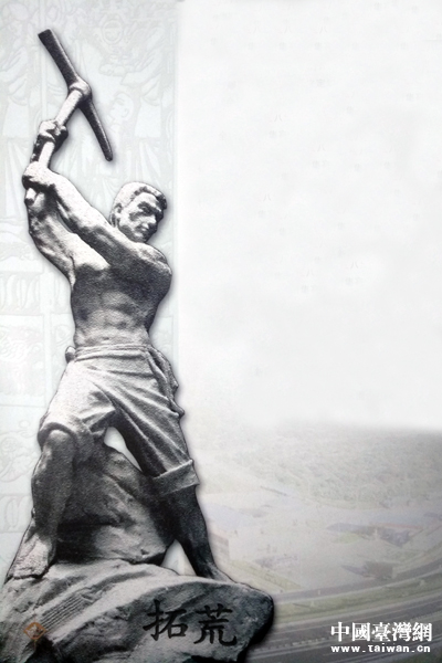 天福集团“唐山过台湾”石雕园内的“拓荒”雕像。(图片翻摄自天福集团宣传册)