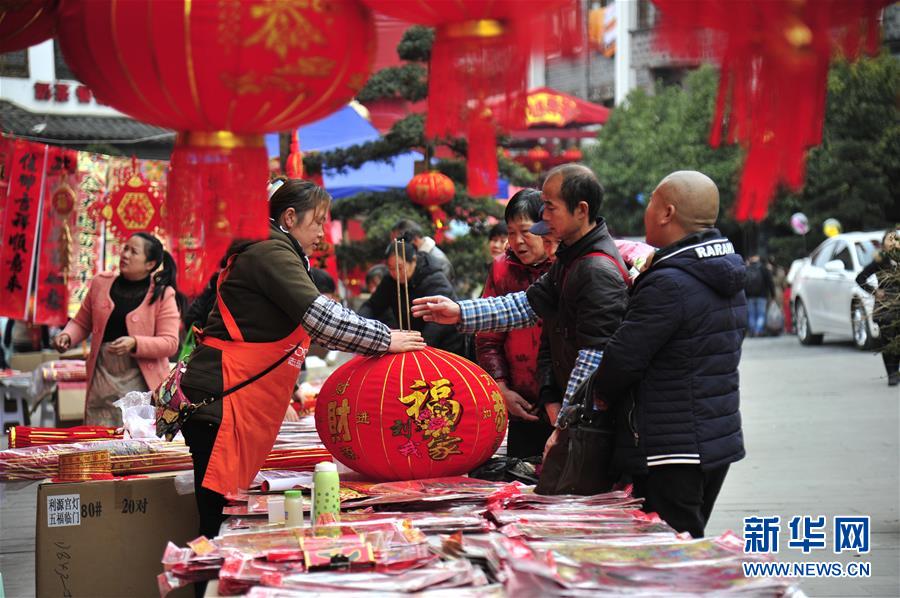 2月13日,市民在贵州黄平县旧州古镇选购红灯笼。春节将至,各地红红火火,一派喜气景象。 新华社发(王永龙 摄)