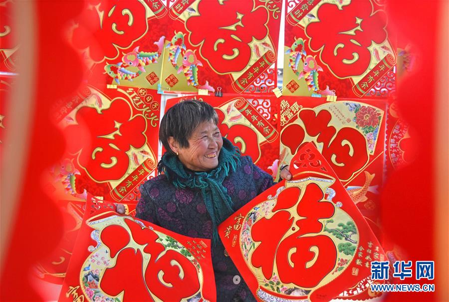 2月13日,市民在山东省沂源县历山街道年货大集上选购福字。春节将至,各地红红火火,一派喜气景象。 新华社发(赵东山 摄)