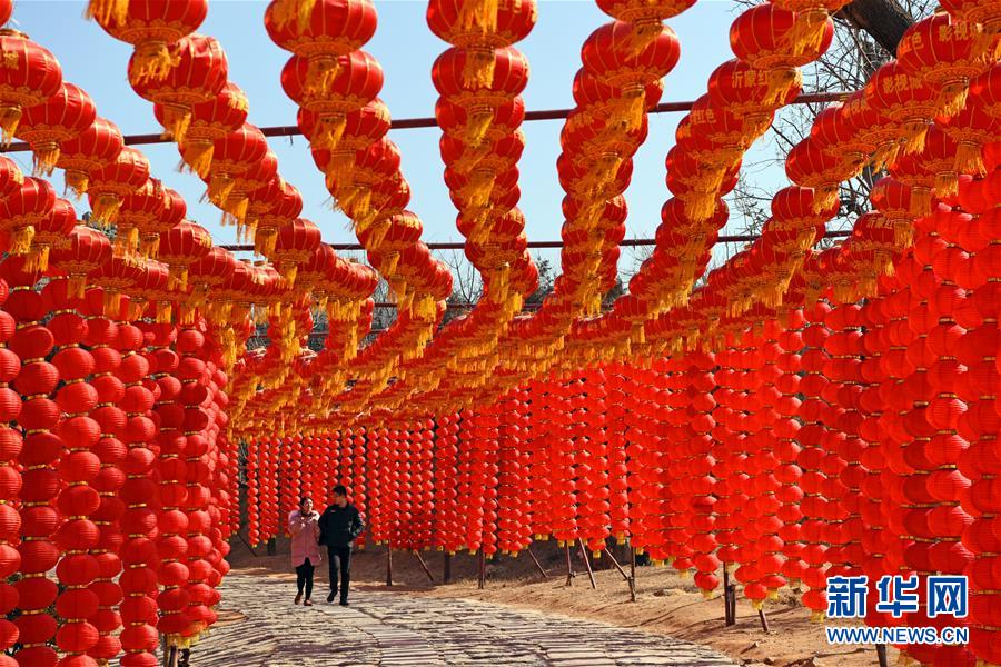 2月13日,在山东省沂南县马牧池乡常山庄村,行人从红灯笼下走过。春节将至,各地红红火火,一派喜气景象。 新华社发(史连赢 摄)