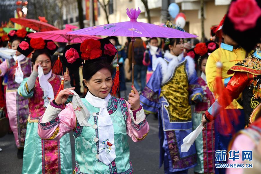 2月25日,在法国巴黎,人们参加春节彩妆大游行。新华社发(杰克·陈 摄)