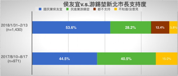 据报道,针对2018新北市长争霸战,“东森新闻云”于今年1月31日至2月13日便启动“新北市长选情大调查”。调查分析发现,设籍于新北市的民众,不管侯友宜对上任何民进党对手,即便是“天王级”人物,都能拿下超过50%的高支持度。