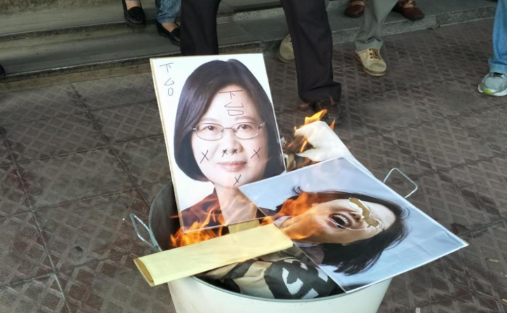 国民党台南党部遭查封 群众挂抗议布条烧蔡英文照片