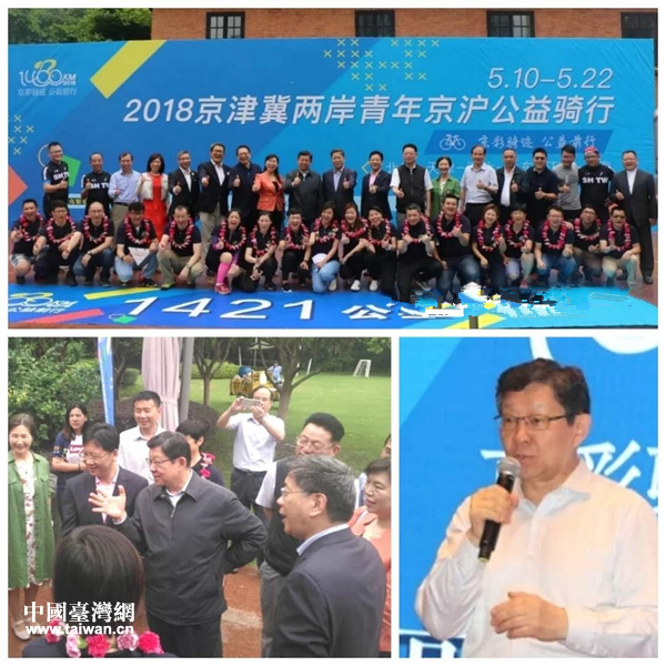 中国台湾网5月25日上海讯 5月22日上午,“京彩骑迹·公益前行”——2018京津冀两岸青年京沪公益骑行活动在上海世博园圆满收官。原海协会会长陈德铭、上海市台办主任李文辉、北京市台办副主任于凤英、上海市台办副巡视员李伟、上海市台协会长李政宏、北京市台协会长章启正等出席仪式。