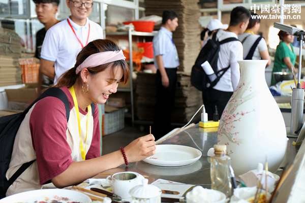 台湾青年在参访过程中体验瓷器彩绘。(中国台湾网 袁楚 摄)