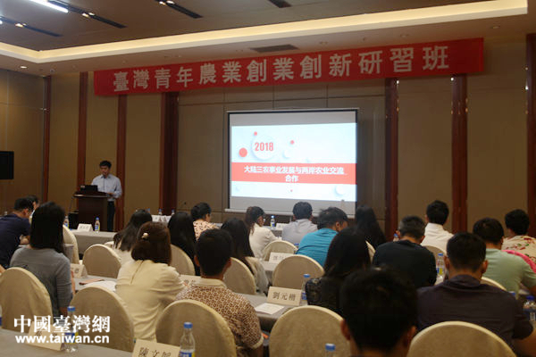 中国台湾网7月21日哈尔滨讯 (记者 陈文韬)“农业是两岸交流的先行者,是两岸交流与合作中起步最早、基础最好、成效最为显著的领域。经过30年发展,两岸农业已经成为全方位、宽领域、多层次的交流与合作格局。”7月21日上午,2018年台湾青年农业创业创新研习班在“冰城”哈尔滨开班,农业农村部对台湾农业事务办公室调研员杨慧军正在向研习班的台湾青年们介绍两岸农业合作交流情况。