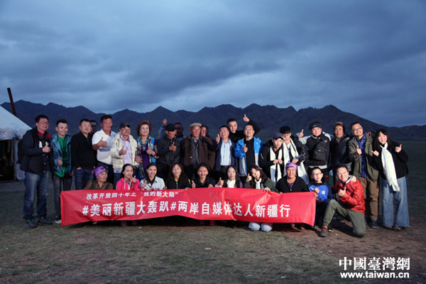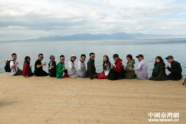 “你好新疆——塞外江南大轰趴”采风团在赛里木湖边合影。(中国台湾网 王怡然 摄)