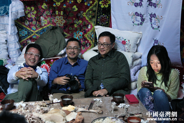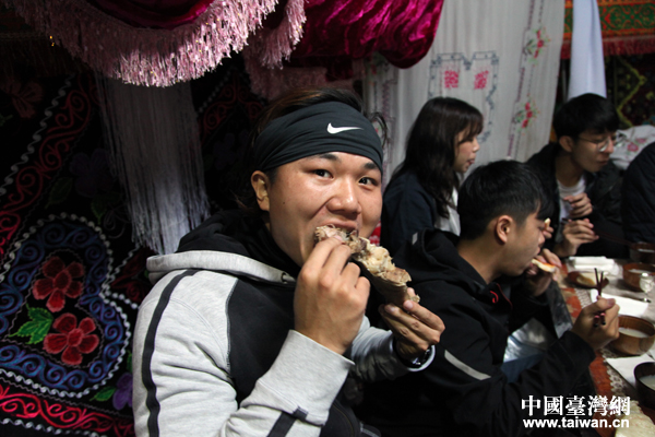 “到了我们这里,就要大口吃肉大口喝酒。台湾的朋友,你们吃好喝好。”克西巴特热情招呼我们。
