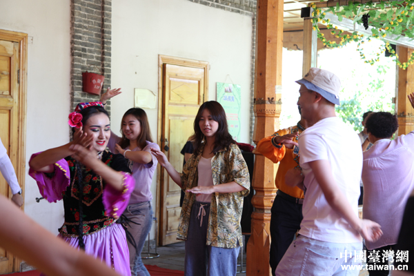 “你好新疆——塞外江南大轰趴”采风团成员、90后台湾编剧彭肇萱舞姿稚拙可爱。(中国台湾网 王怡然 摄)