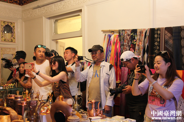 “你好新疆——塞外江南大轰趴”采风团成员在喀赞其民俗旅游区拍摄。(中国台湾网 王怡然 摄)