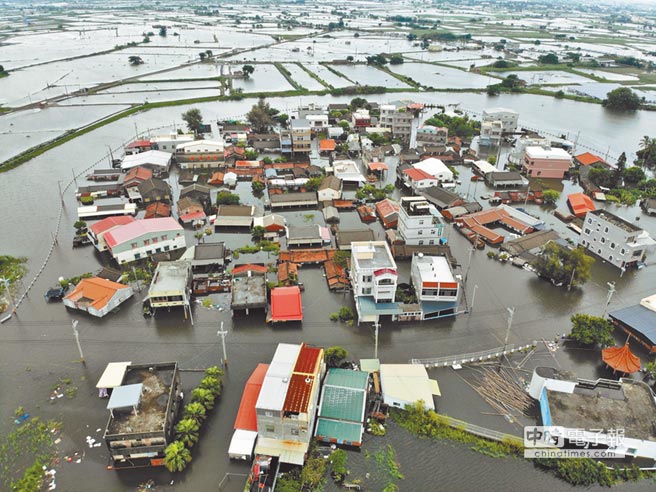 豪雨重创南台湾,嘉义县东石乡掌潭村淹水严重。(图片来源:台湾“中时电子报”)