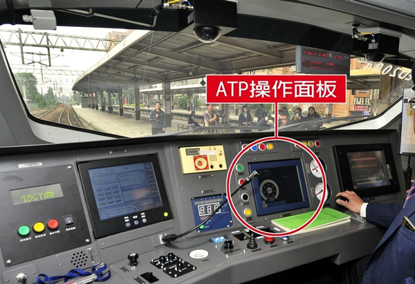台铁普悠玛号列车驾驶舱控制台上司机员前方荧幕即为“ATP操作面板”,上方有显示时速。 (图片来源:台湾《联合报》)