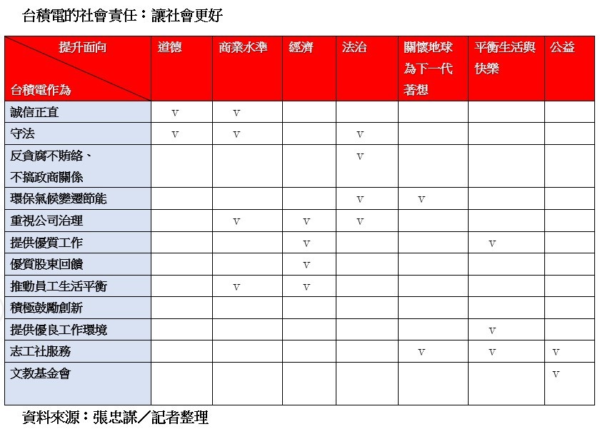 台积电的社会责任。此表将台积电的10项经营理念囊括其中,直行分别为诚信正直,守法,反贪腐不贿络,环保、气候变迁、节能,重视公司治理,提供优质工作,优质股东回馈,推动员工生活平衡,积极鼓励创新,提供优良工作环境,志工社服务,文教基金会等;横列为社会所带来的提升和效应,包括道德、商业水平、经济、法治、为下一代着想、平衡生活与快乐、公益。(图片来源:台湾东森新闻云)