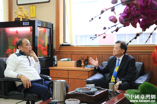 罗文德在公司总经理蔡再展的办公室内,边品茶边谈公司经营等事宜。(中国台湾网 扶海涛 摄)