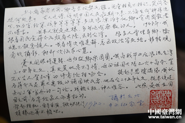 在照片背面,种志斌写道:“苍天开眼时运转,返归故乡乐团圆。”(中国台湾网 扶海涛 翻摄)