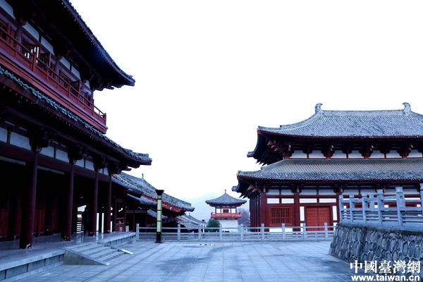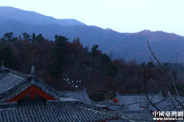两岸人士参观佛教学院,学院岩壁上成群白鸽飞过。(中国台湾网 卢佳静 摄)