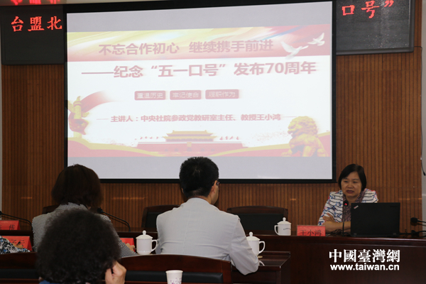 王小鸿作《不忘合作初心 继续携手前进——纪念“五一口号”发布70周年》专题报告。(中国台湾网 汪明珠 摄)
