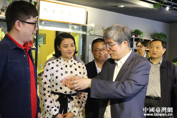 中共中央台办、国务院台办主任助理周宁与宿迁台湾青年就业创业基地的两岸青年交谈。(中国台湾网 张亚静 摄)