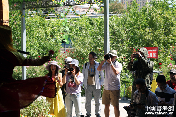 “你好新疆——塞外江南大轰趴”采风团成员拍摄维吾尔族歌舞。(中国台湾网 王怡然 摄)